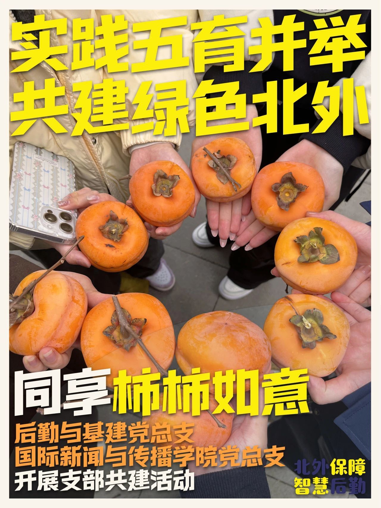为推进构建“三全育人”良好格局,贯彻落实“五育”并举实施方案,不断丰富劳动教育内容,11月15日,后勤与基建党总支动力中心党支部与国际新闻与传播学院本科生党支部联合开展以“实践五育并举、共建绿色北外、同享‘柿柿’如意”为主题的党支部共建活动。